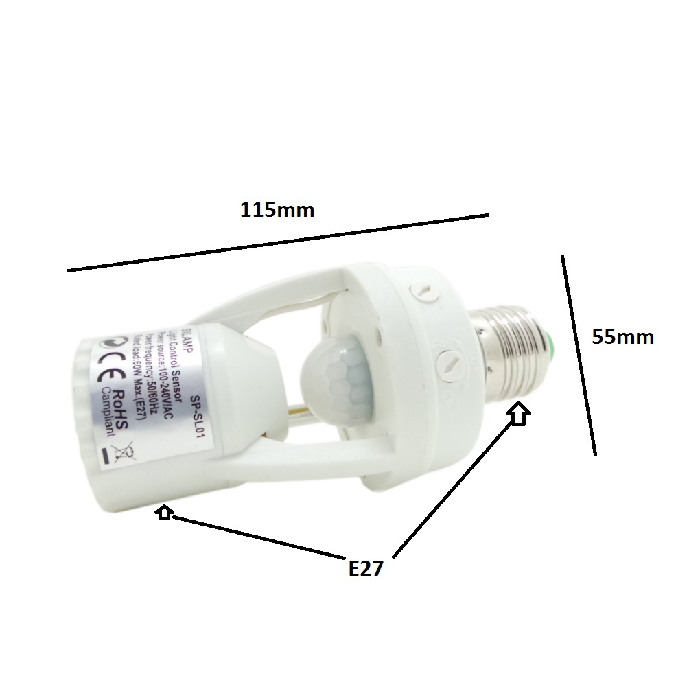 Sensore di movimento E27 Light control sensor Rilevamento di presenza, i sensori di movimento sono dei dispositivi utile per risparmiare energia. In base alla luminosità impostata, sarà sufficiente trovarsi nel campo visivo del sensore, per attivare l'uscita, che può pilotare ad esempio una lampada. Molto comodo in stanze chiuse come sgabuzzini e cantine, dove non dimenticheremo più la luce accesa. In aree aperte per comandare fari o lampade di segnalazione, limitando il funzionamento ad un periodo di tempo predefinito. Utile in tutte quelle situazioni dove si possono avere le mani impegnate ed è quindi comodo che la luce si accenda e spenga in modo automatico. Possibilità di impostare il livello dell'intensità luminosa dell'ambiente a cui si attiva il dispositivo. Rispetto delle normative CE