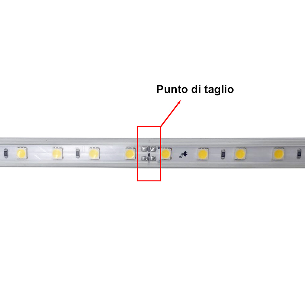 Questa striscia LED 220V può essere tagliata ad ogni 100 cm (1 metro), negli spazi adibiti al taglio, ossia dove troverete le interruzioni della striscia led o il simbolo delle forbici.