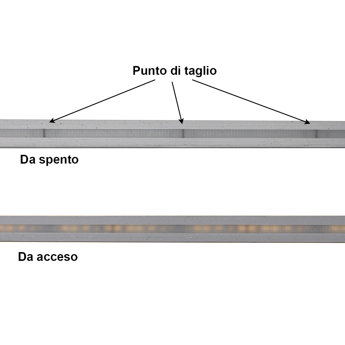 Questa striscia può essere tagliata ad ogni 5 cm, nei punti adibiti al taglio, ossia dove troverete una linea nera nella parte dietro della striscia led.