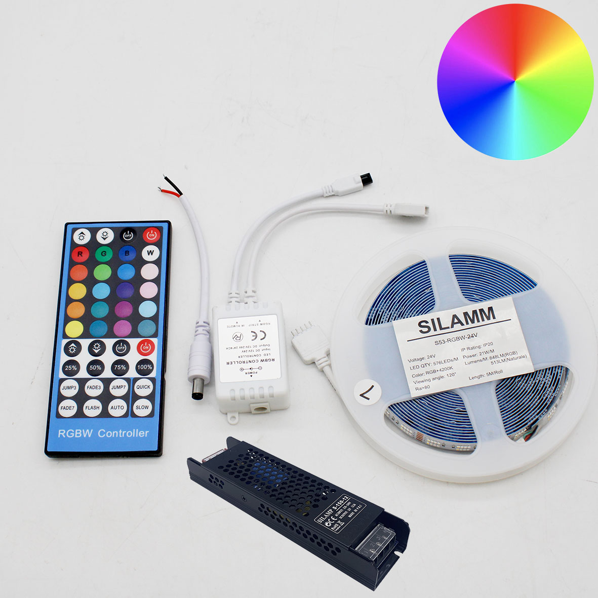 Questo è un kit di illuminazione completo che include una striscia LED flessibile RGBW del modello S53-RGBW-24V, pensata per un'illuminazione d'accento e decorativa versatile e di alta qualità. Il kit comprende tutti i componenti necessari per un'installazione immediata e un controllo completo dell'illuminazione.