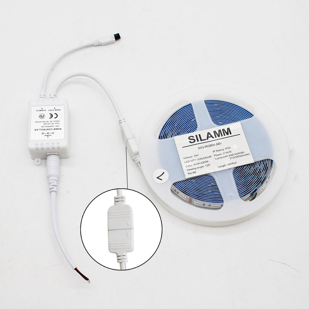 Controller RGBW e connessioni CONTROLLER-RGBW: Un'unità di controllo compatta che permette di gestire le funzioni della striscia e un cavo di connessione con jack DC.