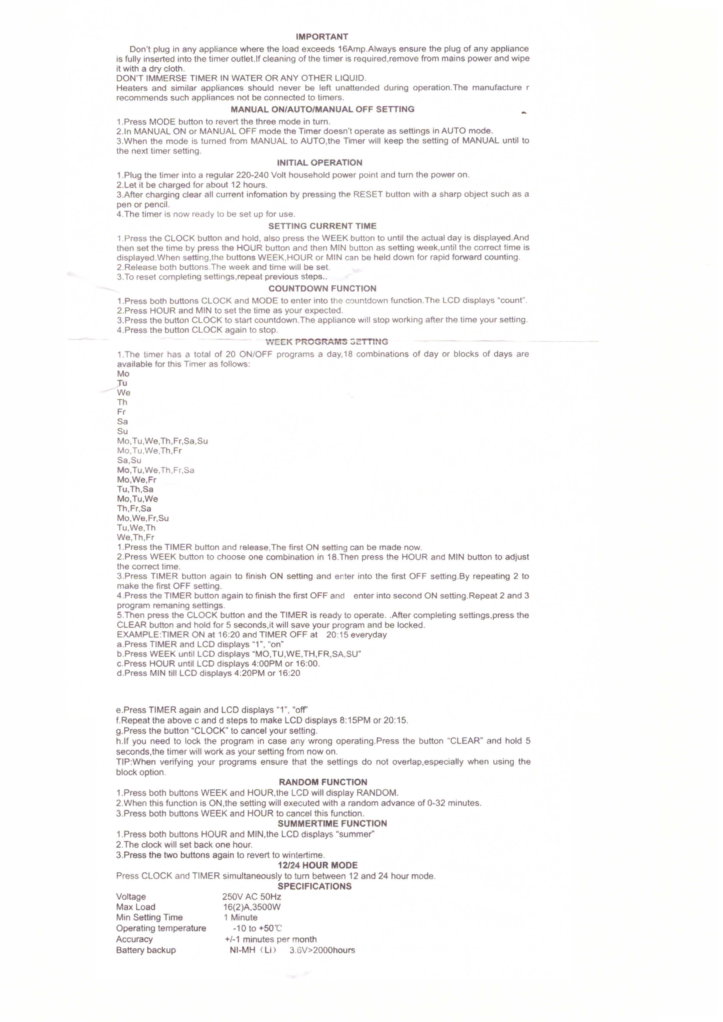 Batteria di backup interna, in mancanza momentanea di alimentazione il timer non prede le impostazioni