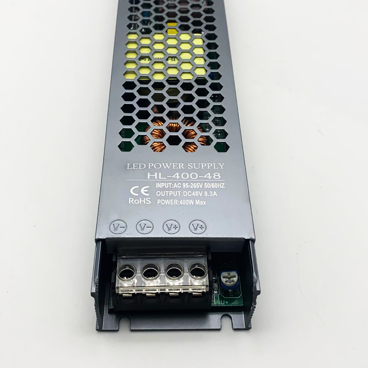 Trasformatore led corrente continua da potenza massima 400w e corrente in uscita 8.3 A è compatibile con tutti i corpi luminanti 48v DC per Binario magnetico ad incasso.