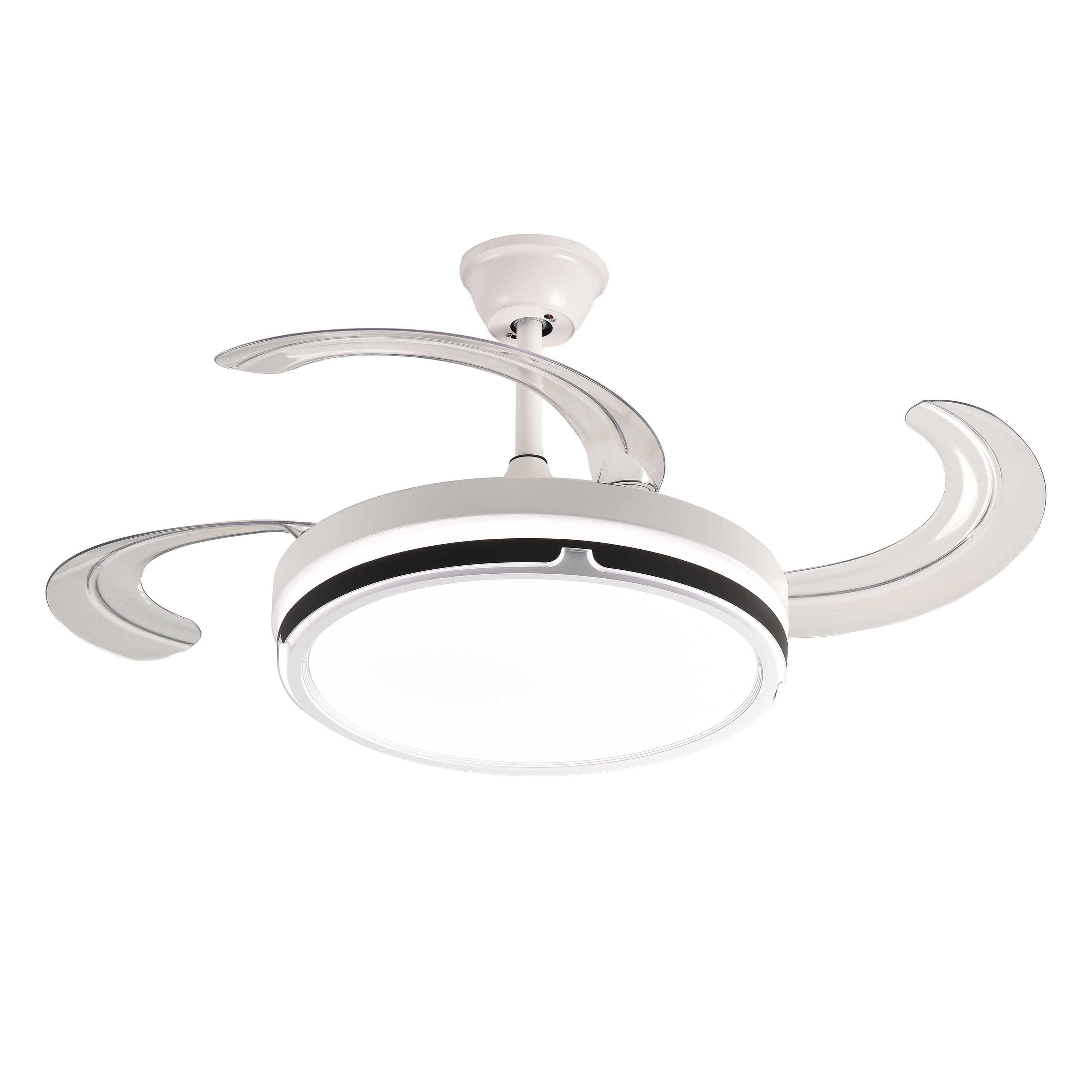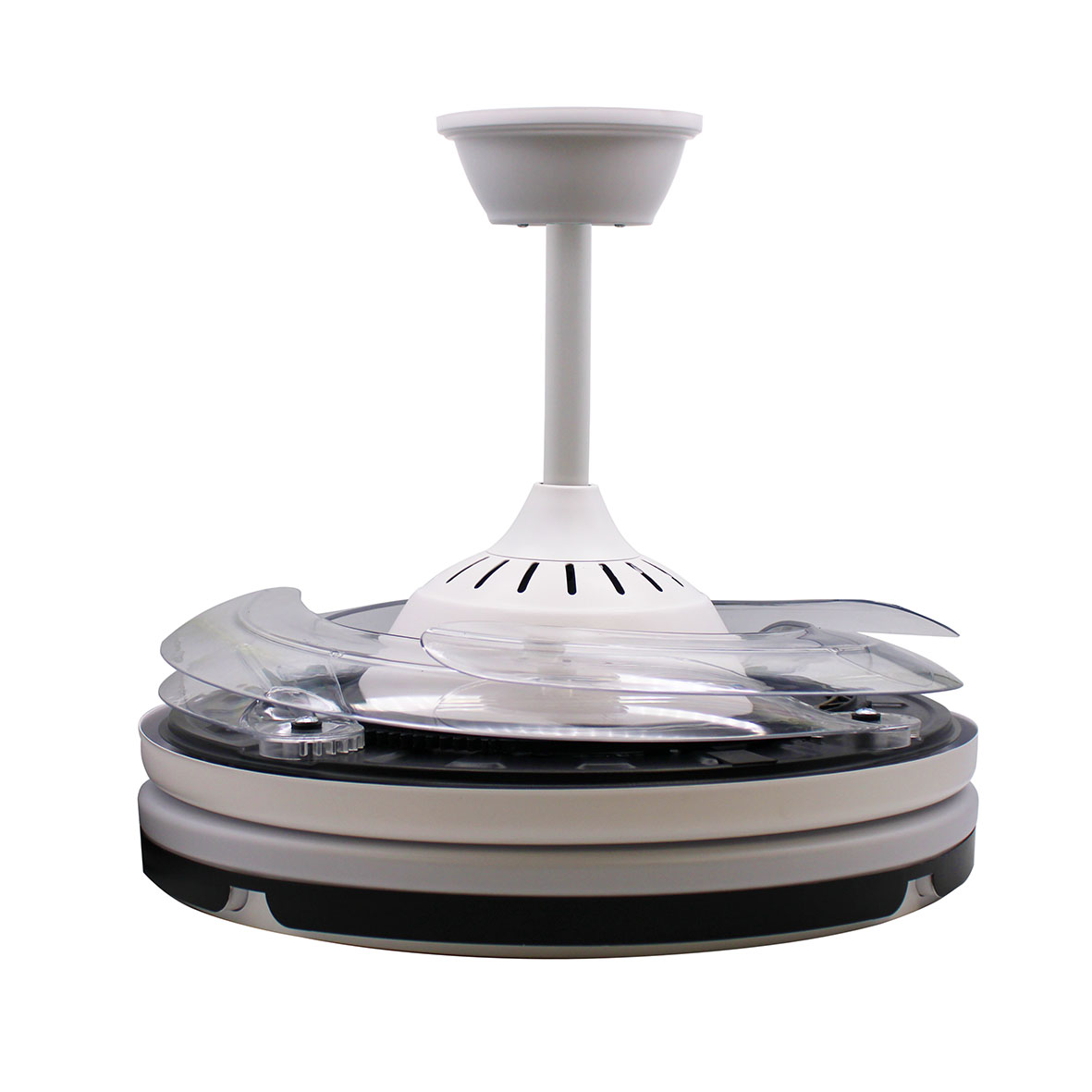 Una volta spento il ventilatore, le pale si ritirano e rimangono nascosti sopra il motore.